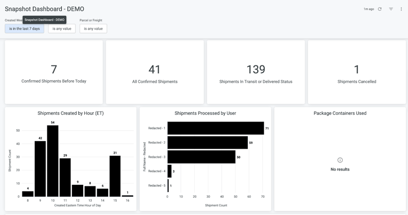 With filters for Created Week, City, Parcel or Freight, Warehouse, and Destination Location Type, the Snapshot Dashboard includes the following tiles for the most current information: